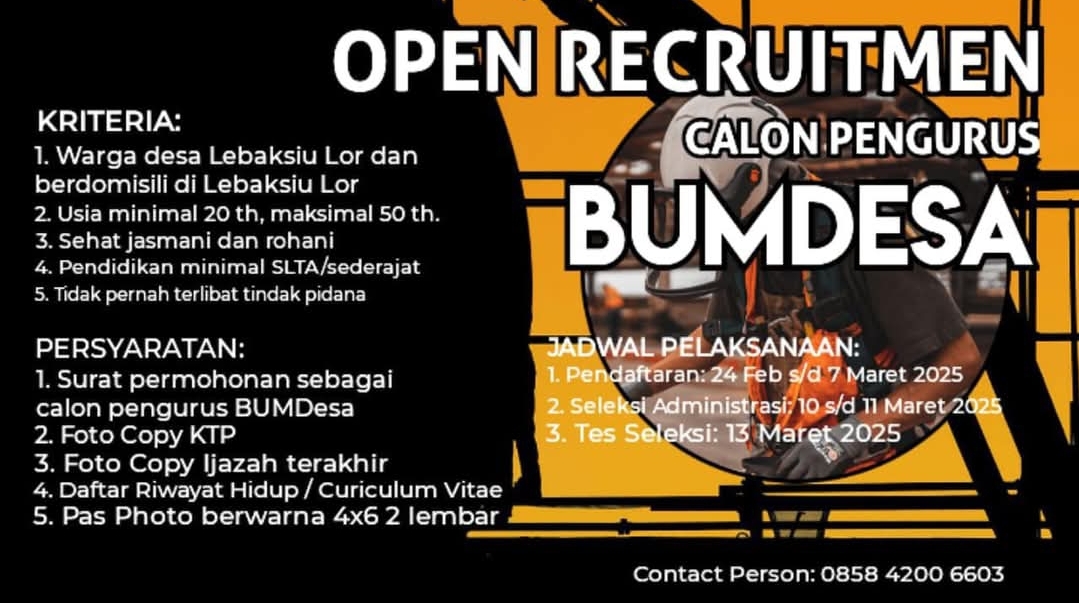 Recrutmen calon pengurus BUMDESA Lebaksiu Lor, untuk tanggal pendaftarannya adalah dari tanggal 24 Februari sampai 7 Maret 2025.